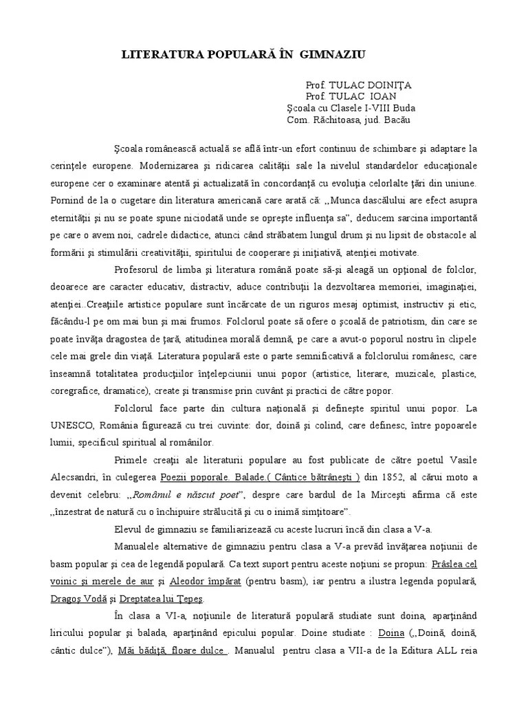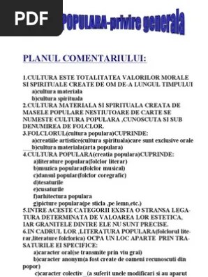 Caracter traditional (sistem de mijloace artistice consacrat); Caracter traditional (sistem de mijloace artistice consacrat); Odata cu progresul civilizatiei literatura populara nu va disparea. Spre deosebire de literatura populară, literatura cultă cuprinde: 18.09.2011 · literatura populara concentreaza, in intregul sau, experienta de veacuri a poporului nostru, conceptia despre lucruri fundamentale referitoare la existenta umana. Eminescu inalta expresia populara la rangul meditatiei geniale unice, pe cand creanga reia talcul popular de la nivel cult. Trasaturile care definesc folclorul, in care se include si literatura populara, sunt:. Ele ii orienteaza pe copii spre prietenie, iubirea aproapelui, respectul pentru meleagurile.