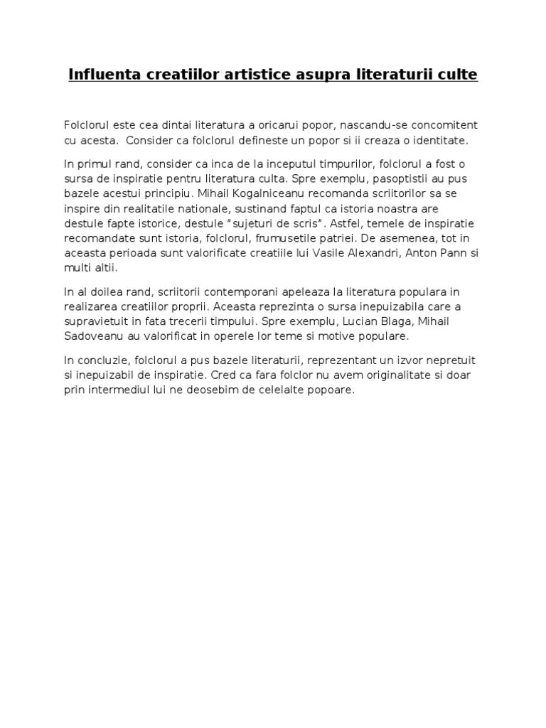 Eminescu inalta expresia populara la rangul meditatiei geniale unice, pe cand creanga reia talcul popular de la nivel cult.. Semnificații precise, formulele de invocare sau tămăduitoare (descântece curative, vrăji, blesteme) presupun nu numai un text, ci și un ritual, o gestică, având valoare magică. Spre deosebire de literatura populară, literatura cultă cuprinde: Trasaturile care definesc folclorul, in care se include si literatura populara, sunt: O tema foarte valoroasa a poeziei pentru copii o constituie copilaria, prin caracterul acesibil, atractiv si interesant, fiindca vorbeste despre viata celor de o varsta cu cititorii, dar, si pentru mesajele educative ale poeziilor cu aceste subiecte; Aceea au o deosebita valoare educativa si artistica.. Literatura populara este o parte semnificativa a folclorului romanesc, care inseamna totalitatea productiilor intelepciunii unui popor (artistice, literare, muzicale, plastice, coregrafice, dramatice), create si transmise prin cuvant si practici, de catre popor.