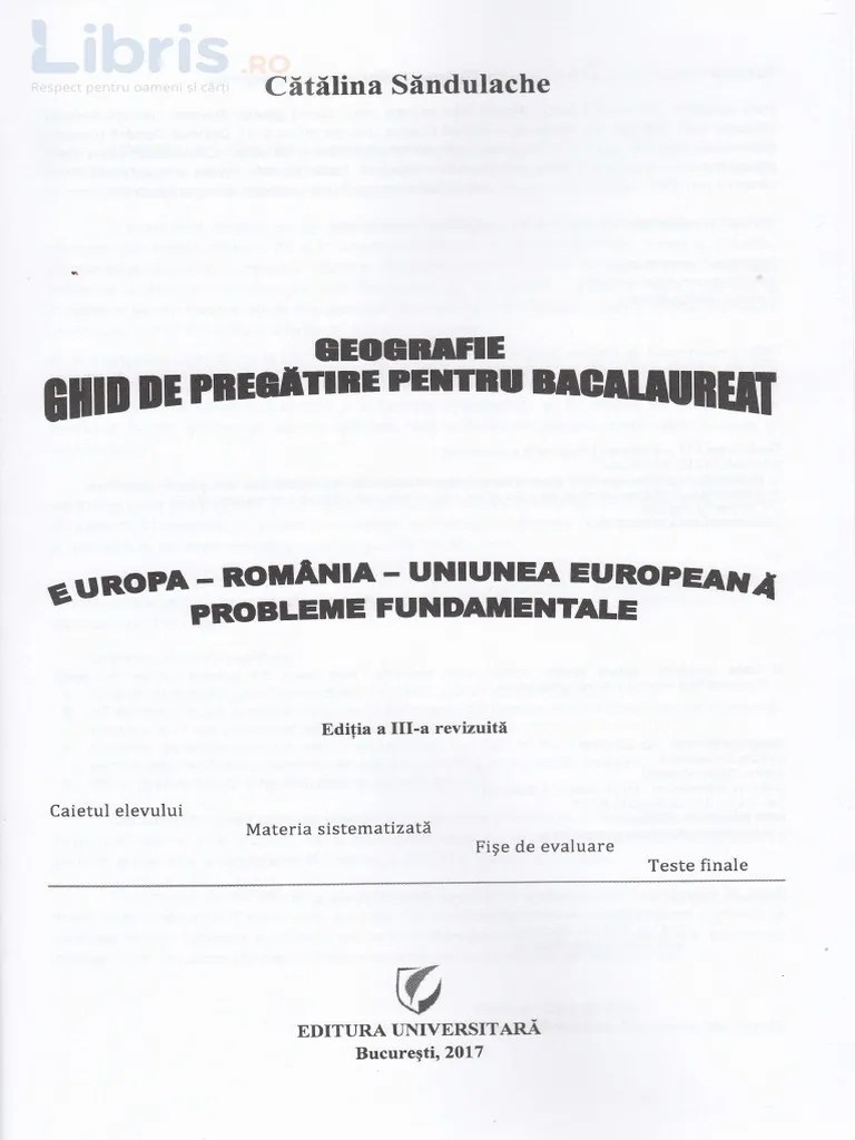 În consecinţă, miza acestui examen devine din.. ( 0 recenzii de la clienți) examenul de bacalaureat reprezintă un moment deosebit de important pentru elevii din clasele terminale, dar şi un criteriu esenţial pentru admiterea în învăţământul superior. Ghid de pregătire intensivă pentru examenul de bacalaureat.. Ghidul bacului la geografie reprezintă un îndrumar pentru elevii de liceu care au ca probă disciplina geografie la examenul de bacalaureat, dar şi pentru cei care vor să îşi perfecţioneze cunoştinţele în domeniu sau pur şi simplu sunt pasionaţi de geografie.